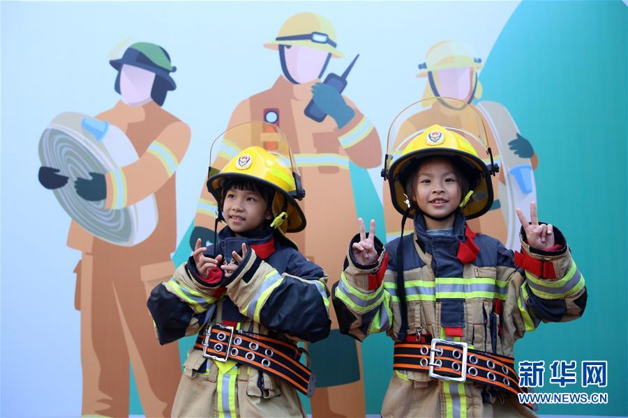 11月24日,在厦门市消防救援支队特勤大队,小朋友穿戴灭火防护装备拍照留影。 新华社发(曾德猛 摄)