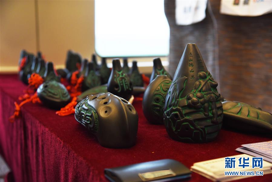 11月24日在“高铁环游齐鲁”体验列车上拍摄的山东泰安陶笛工艺品。新华社记者 王凯 摄