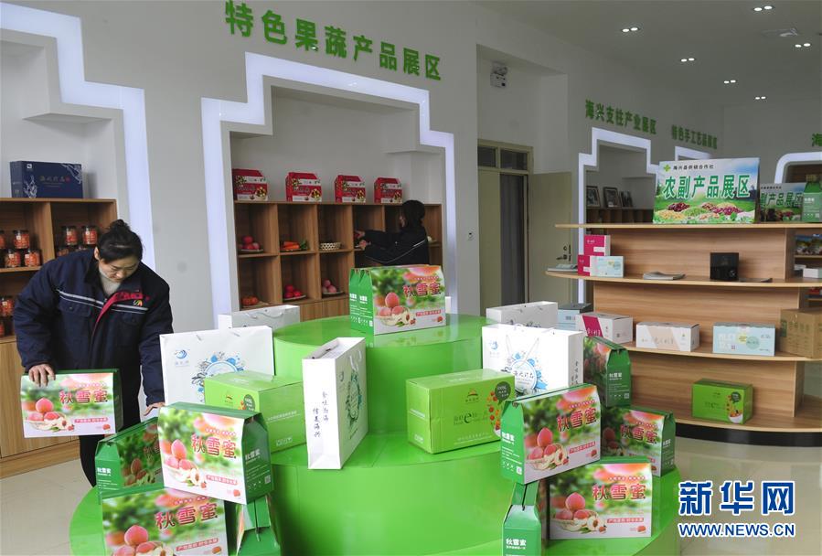 11月25日,工作人员在海兴县农村电子商务公共服务中心展室内摆放展示的农产品。 近年来,河北海兴县把消费扶贫作为发挥全社会力量参与扶贫的切入点和突破口,积极探索“电商企业+农业合作社+贫困户+消费扶贫”的模式。目前,海兴县通过设立“电商消费扶贫专柜”,“线上+线下”展示销售农业合作社和贫困户的“订单式”农副产品,带动1600余名建档立卡贫困户和17个贫困村集体实现增收。 新华社记者 牟宇 摄