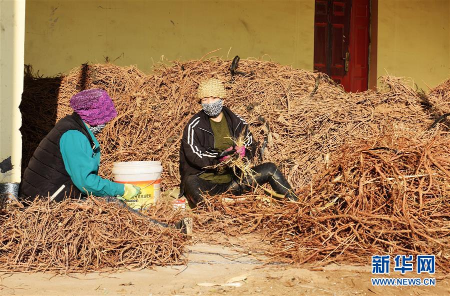 11月21日,在内蒙古磴口县,内蒙古王爷地苁蓉生物有限公司工人在分拣甘草。新华社记者 李云平 摄