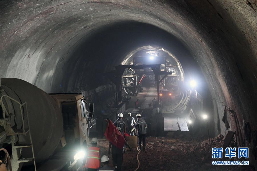 11月25日,中铁十八局集团工作人员在三家村隧道作业。 当日,由中铁十八局集团有限公司负责施工的玉磨(玉溪—磨憨)铁路三家村隧道顺利贯通。三家村隧道全长3470米,自2016年10月开工建设以来,参建人员克服隧道地质复杂、多变、浅埋等多种不良条件,实现隧道顺利贯通。 玉磨铁路是泛亚铁路中线昆明至曼谷的重要组成部分,正线全长500多公里,设计速度为每小时160公里。 新华社记者 杨宗友 摄
