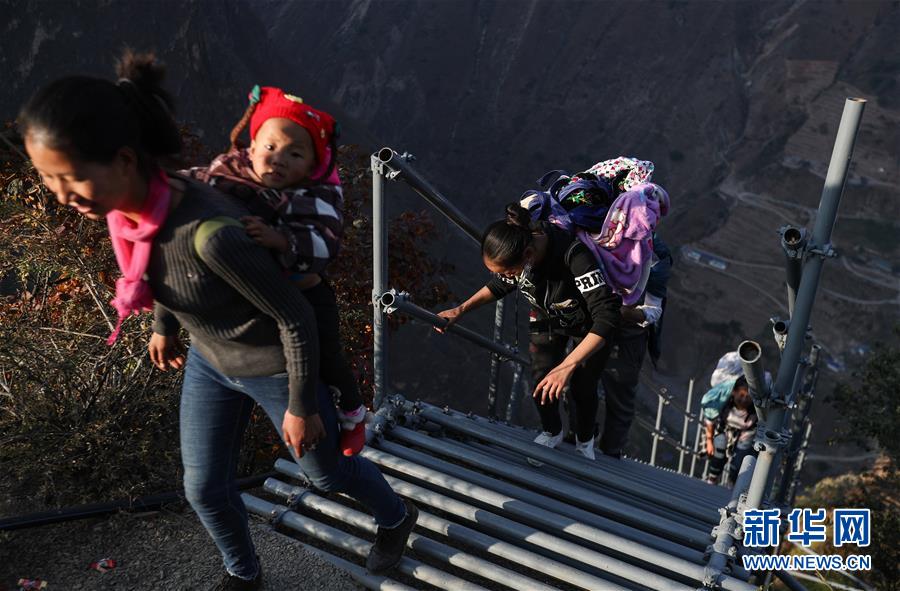 彝族年期间,几名彝族群众爬上钢梯来到阿土列尔村拜年(11月24日摄)。新华社记者 江宏景 摄