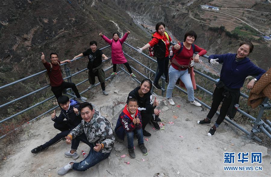 一群从阿土列尔村钢梯往山下走的游客在途中休息(11月23日摄)。新华社发(王曦 摄)