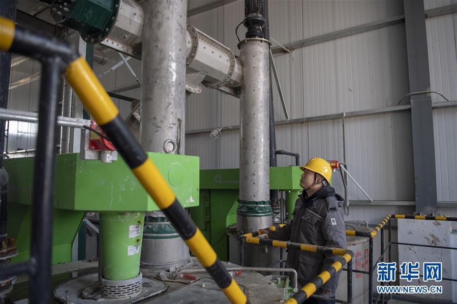 11月26日,在位于原平市解村乡解村的山西神沐新能源公司内,工作人员查看秸秆搅拌设备的运行情况。 新华社记者 杨晨光 摄