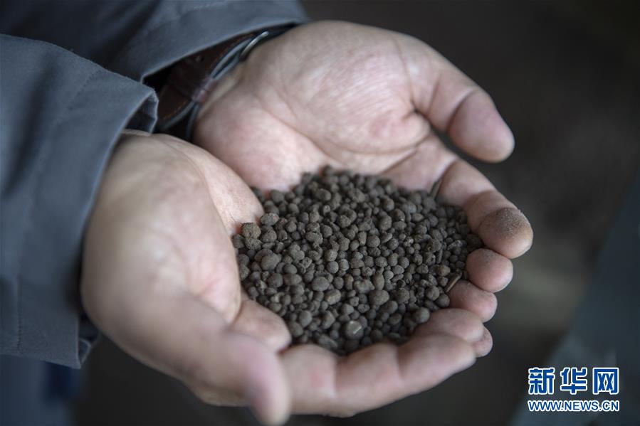 11月26日,在位于原平市解村乡解村的山西神沐新能源公司内,工作人员展示以秸秆为主要原料生产的有机肥。 新华社记者 杨晨光 摄