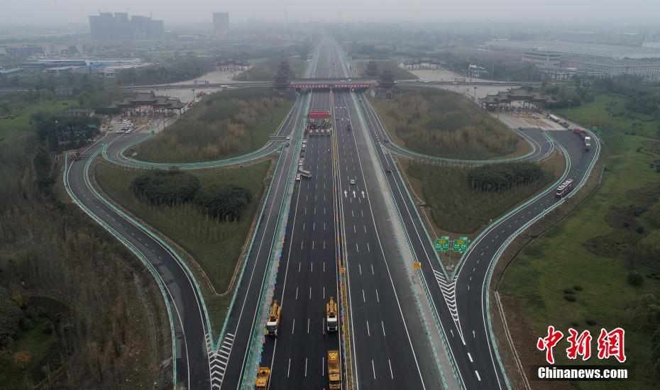 11月27日,四川眉山,航拍成乐高速扩容项目试验段眉山收费站。当日,G0512成(都)乐(山)高速公路扩容项目试验段建成通车。此次通车路段由青龙场至眉山,共28公里。成乐高速是四川黄金旅游通道,通车后该段道路拥堵现状将得到缓解。 中新社记者 刘忠俊 摄
