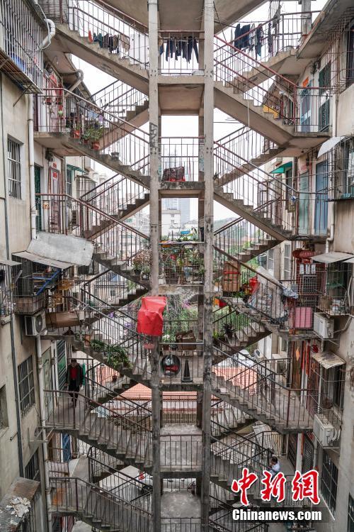11月27日,记者探访广西南宁唐山路28号网红“鸳鸯楼”。该建筑始建于上世纪八十年代,因其两侧楼栋之间通过双向楼梯层层相连,被网友戏称为“鸳鸯楼”。该建筑近年来已成为南宁一网红打卡胜地。 中新社记者 陈冠言 摄