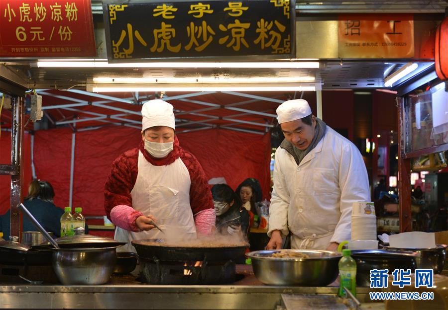 11月27日,在开封鼓楼夜市,小吃摊主为客人制作炒凉粉。 新华社记者 任鹏飞 摄