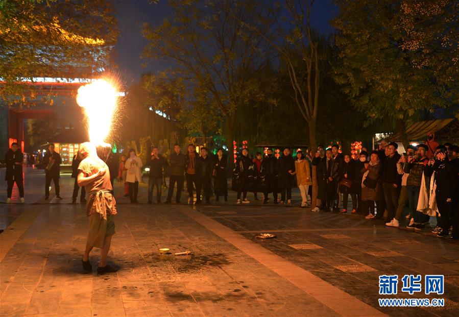 11月26日,游客在开封清明上河园景区观赏特技表演。 新华社记者 任鹏飞 摄