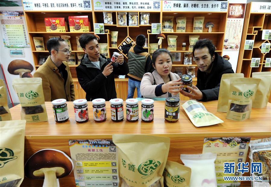 11月27日,在荔浦市花篢镇南源村香菇电商展示销售平台,客商在挑选香菇加工制品。 广西荔浦市花篢镇西北的南源村是荔浦最边远的水库移民村。全村496户,其中建档立卡贫困户63户。2016年起,花篢镇先后在南源村、大江村建成了占地40多亩、种植规模达40万筒的香菇现代化种植示范基地。 南源村香菇集体经济的发展,带动周边村屯和农户加入到香菇种植中来,为贫困户在家门口提供就业岗位。当地依托产业精准施策,发展壮大村级集体经济,并与电子商务相结合,构建“村委+电商+农特产品”的电子营销模式,通过蘑菇种植,增加贫困户的经济收入,夯实产业脱贫致富道路。 新华社记者 冯为民 摄