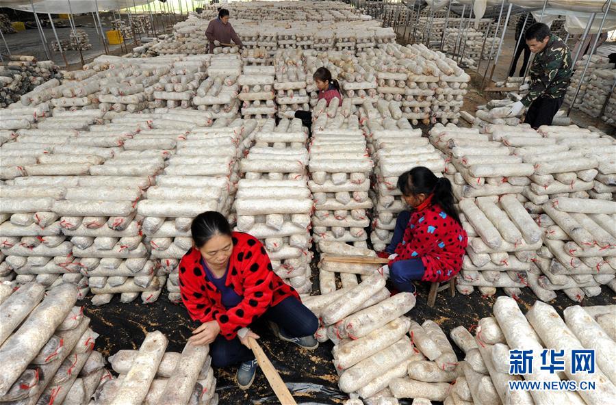 11月27日,在荔浦市花篢镇南源村香菇现代化种植示范基地,种植户给菌筒放气,让里面的菌丝不会因为缺氧而死亡。 广西荔浦市花篢镇西北的南源村是荔浦最边远的水库移民村。全村496户,其中建档立卡贫困户63户。2016年起,花篢镇先后在南源村、大江村建成了占地40多亩、种植规模达40万筒的香菇现代化种植示范基地。 南源村香菇集体经济的发展,带动周边村屯和农户加入到香菇种植中来,为贫困户在家门口提供就业岗位。当地依托产业精准施策,发展壮大村级集体经济,并与电子商务相结合,构建“村委+电商+农特产品”的电子营销模式,通过蘑菇种植,增加贫困户的经济收入,夯实产业脱贫致富道路。 新华社记者 冯为民 摄