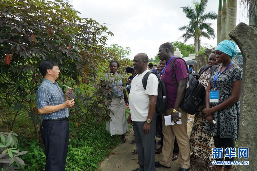 在位于海南省儋州市的中国热带农业科学院儋州校区,来自冈比亚等非洲国家的学员在参观木薯种质资源基地(2018年9月11日摄)。新华社记者 王军锋 摄
