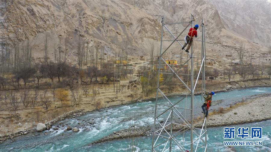 在新疆塔什库尔干塔吉克自治县的深山中,电力工人刘建国(下)和工友杨显辉在铁塔上安装零件(11月24日无人机拍摄)。