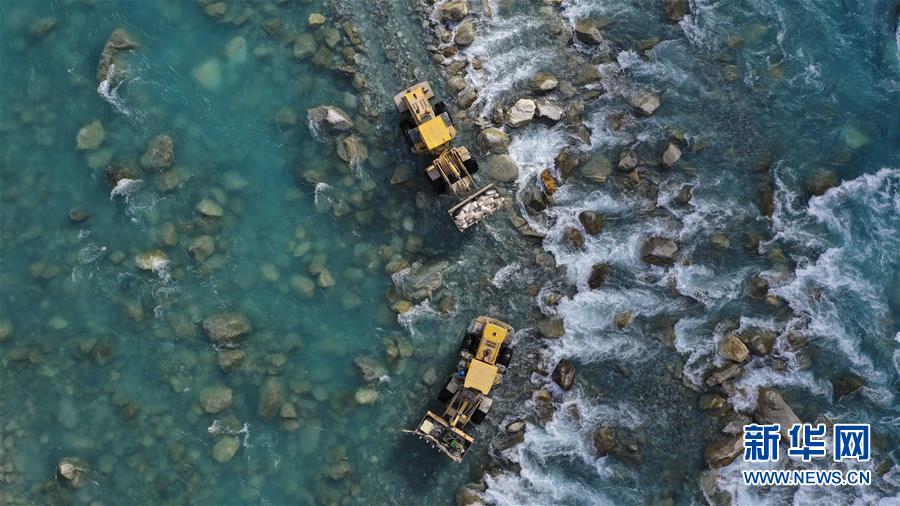在新疆塔什库尔干塔吉克自治县大同乡库如克栏杆村,电力工人利用施工车辆运送水泥、铁塔零件过河,为铺设线路做准备(11月24日无人机拍摄)。新华社记者 胡虎虎摄