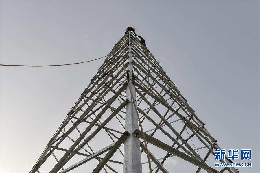 电力工人在新疆塔什库尔干塔吉克自治县大同乡的一处铁塔上进行高空作业(11月24日拍摄)。新华社记者 胡虎虎摄