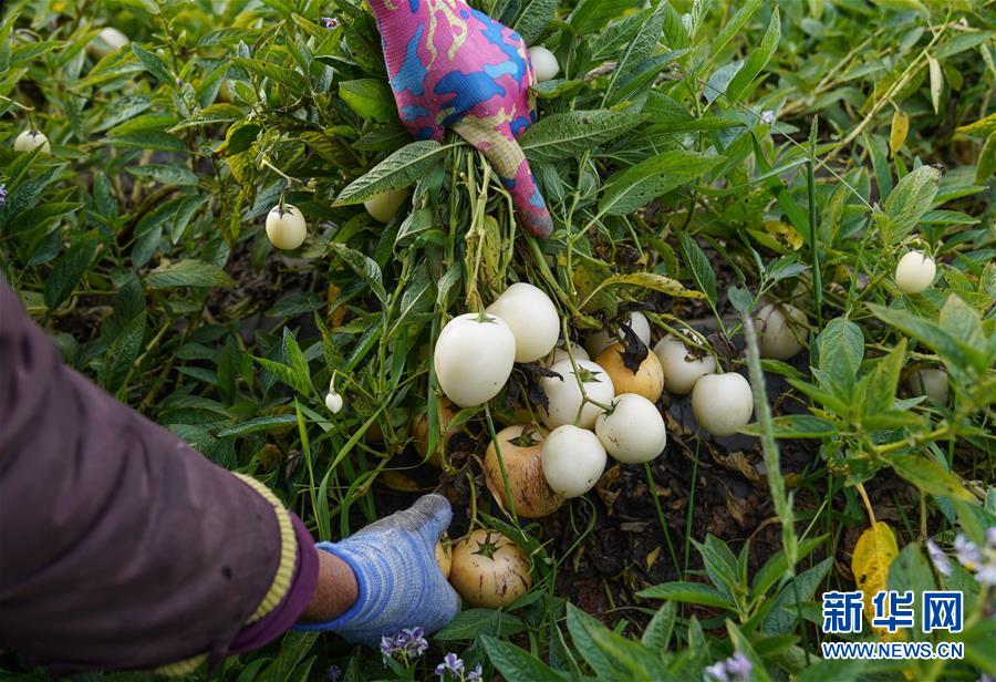 11月28日,在云南省石林彝族自治县西街口镇路花村,张建伟母亲黄兰芳在田地里采集人参果。新华社记者 晋美多吉 摄