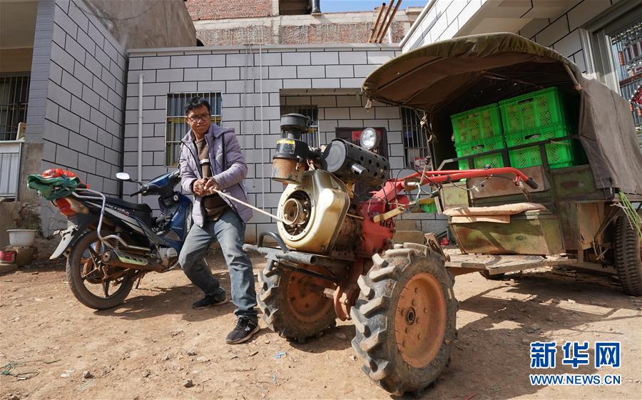 11月28日,在云南省石林彝族自治县西街口镇路花村,张建伟发动拖拉机准备把采摘下来的人参果送到农业专业合作社去卖。 新华社记者 程敏 摄