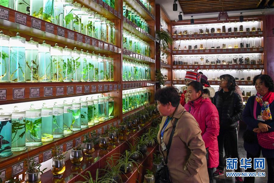 游客在石林杏林大观园中医文化展览馆参观了解各种中药原料(11月28日摄)。 新华社记者 马平 摄