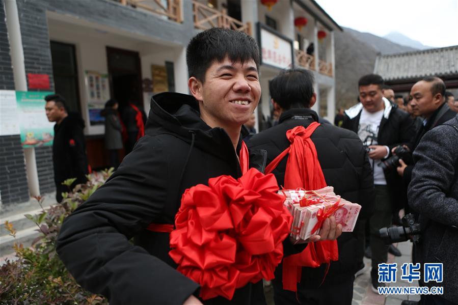 11月28日,在甘肃省陇南市宕昌县官亭镇付家村,村民在分红仪式现场领取分红。
