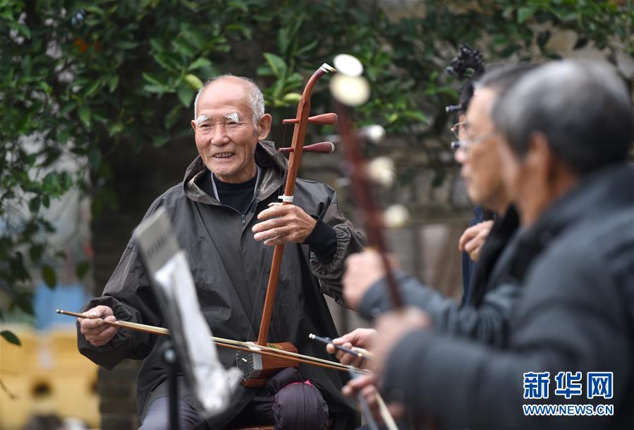 11月30日,郦礼元(左)和村民一起拉二胡。 新华社记者 韩传号 摄