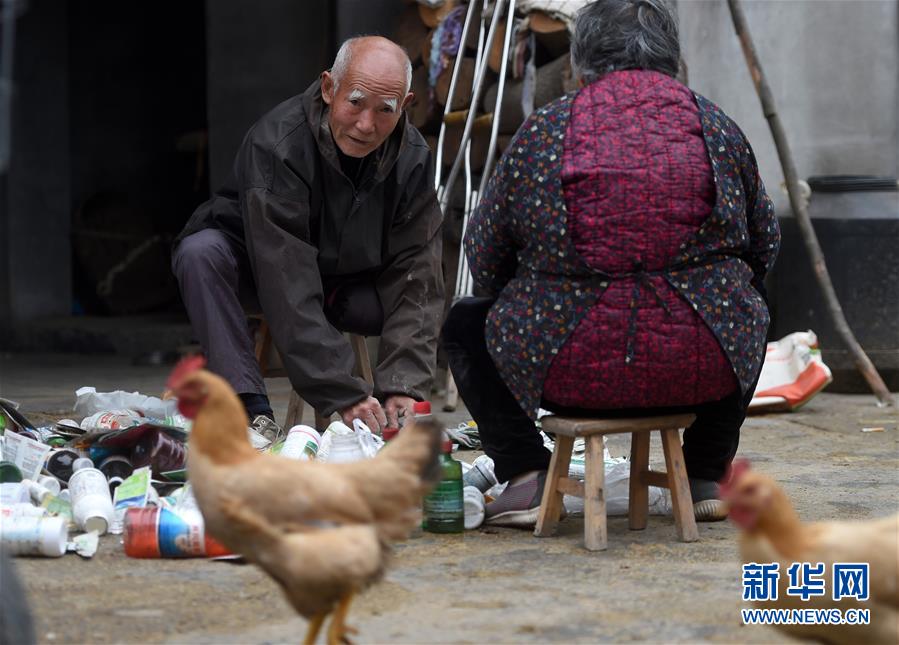 11月30日,郦礼元(左)和妻子楼成芳在家中将捡来的农药废弃包装分类。 新华社记者 韩传号 摄