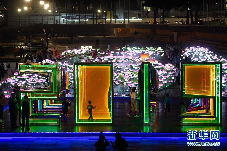 12月1日,市民在南湾湖畔的光影节上游览。 当晚,一年一度的“2019澳门光影节”在南湾湖畔开幕,活动内容包括光雕表演、灯饰装置和互动游戏等,让市民和游客感受澳门即将迎来回归祖国20周年的喜庆氛围。 新华社记者 张金加 摄