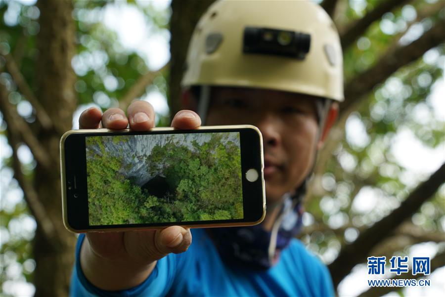 11月24日至11月30日,一支跨国洞穴探险队在广西东兰县连续探险7天后,发现两个大型天坑和十几个相对较小的溶洞。东兰县是喀斯特地貌区,红水河流经此地,两岸植被茂密,人迹罕至。探险队先后进入多个洞穴,经实地测算,确认“小弄坤2号天坑”深度超过300米,底部宽约250米,长120米,属于世界排名前50的大型天坑。此外,“弄丘天坑”深295米,宽约50米,长100米,同样属于大型天坑。图为探险队员用手机展示无人机实时拍摄的“小弄坤2号天坑”画面(11月26日摄)。 新华社发 陈立新 摄 图片来源:新华网