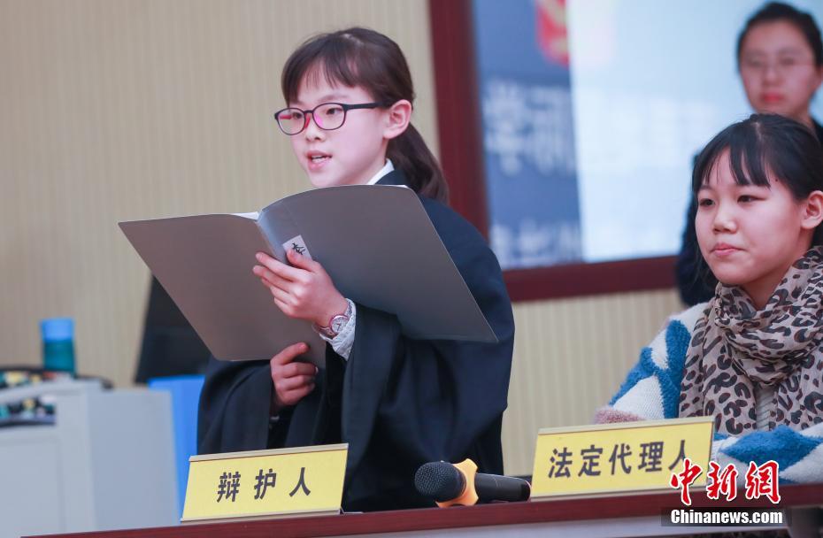 12月3日,第六个“国家宪法日”前夕,北京市朝阳区芳草地国际学校开设模拟法庭,小学生们通过扮演审判长、公诉人、辩护人等法庭角色,了解宪法知识,体验法庭审理程序。图为“辩护人”在模拟法庭上进行辩护。中新社记者 贾天勇 摄