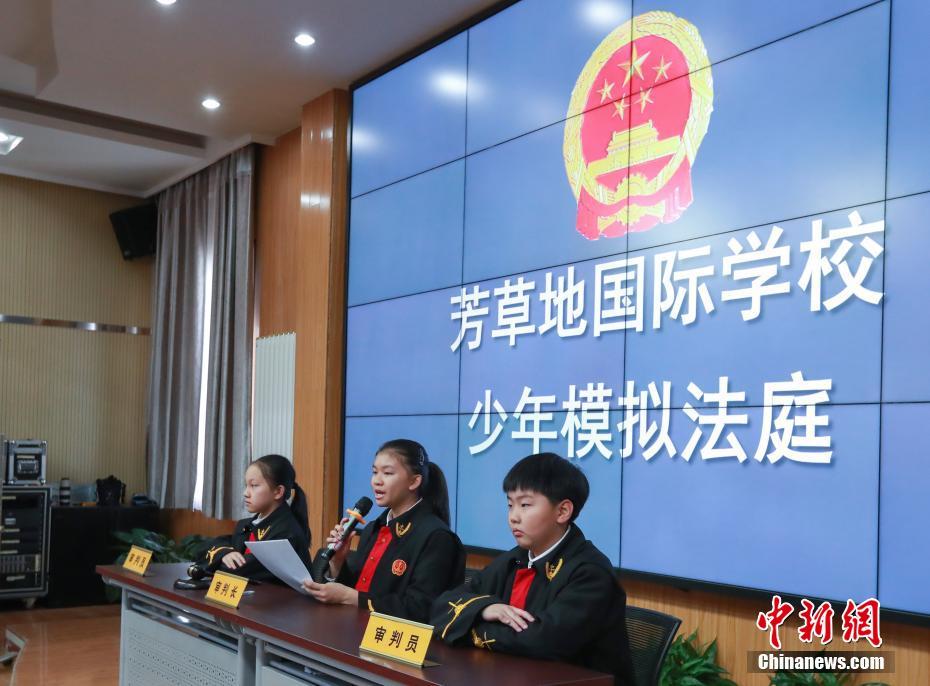 12月3日,第六个“国家宪法日”前夕,北京市朝阳区芳草地国际学校开设模拟法庭,小学生们通过扮演审判长、公诉人、辩护人等法庭角色,了解宪法知识,体验法庭审理程序。中新社记者 贾天勇 摄