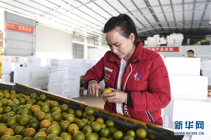 甘有琴在发货仓库内检查、挑选水果(12月3日摄)。新华社记者 曹祎铭 摄