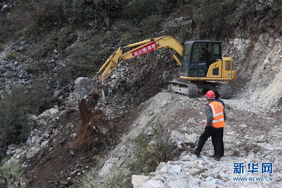 通过米-26重型直升机运载到布拖县阿布洛哈村的大型机械开始工作(12月5日摄)。 新华社记者 江宏景 摄