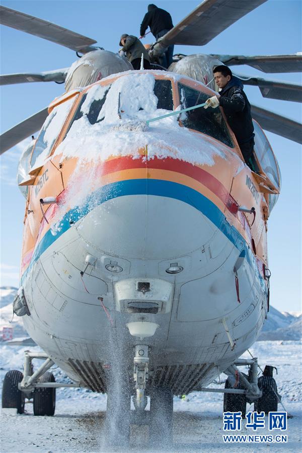 在布拖县城,机务人员给米-26重型直升机除雪。布拖县多变的天气让这台直升机连续两天无法执飞(12月5日摄)。 新华社记者 江宏景 摄