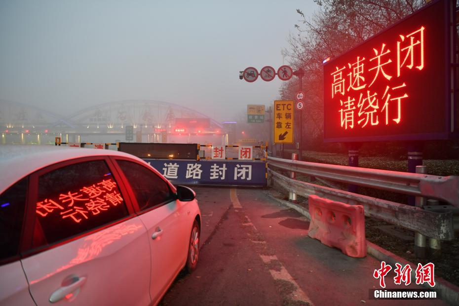 12月8日,河北省气象台发布大雾红色预警信号,唐山南、保定、雄安新区、廊坊、石家庄等地有能见度不足200米的雾。该省境内北京以南及北京以东地区局地能见度不足50米,雾区高速公路关闭。图为石家庄一高速上道口因雾关闭。中新社记者 翟羽佳 摄