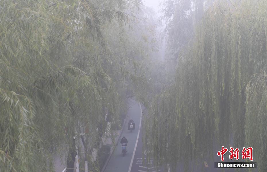 12月8日,山东济南,市民在浓雾中晨练。当日,山东省气象台发布大雾红色预警信号,济南、青岛等11个地区出现能见度低于50米的特强浓雾。中新社记者 张勇 摄