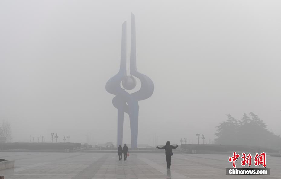12月8日,山东济南,市民在浓雾中晨练。当日,山东省气象台发布大雾红色预警信号,济南、青岛等11个地区出现能见度低于50米的特强浓雾。中新社记者 张勇 摄
