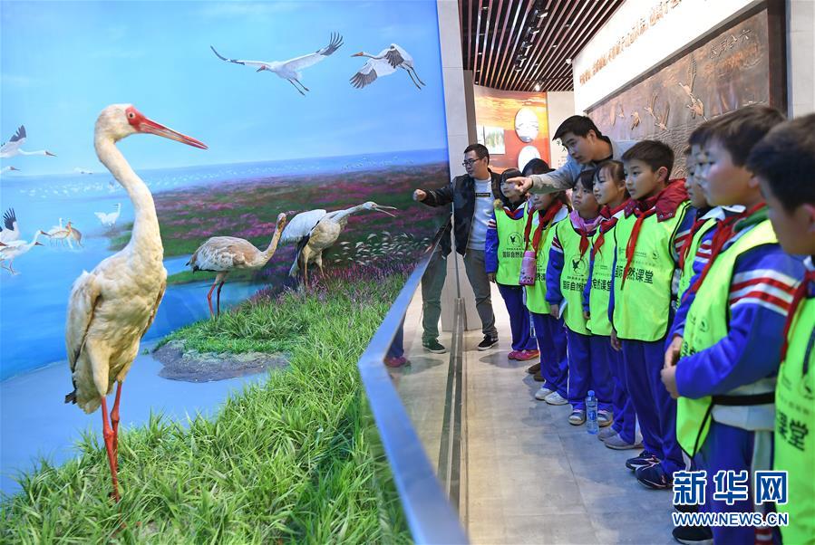 12月8日,来自永修县吴城中心小学的孩子们在老师带领下参观宣教中心的动物标本。 当日,位于江西省永修县的鄱阳湖湿地和候鸟宣传教育中心正式向公众开放。该中心总展馆面积1314平方米,通过动物标本、动画视频、图片图表、AR体验等展示形式带领观众了解候鸟,读懂鄱阳湖。 新华社记者 万象 摄
