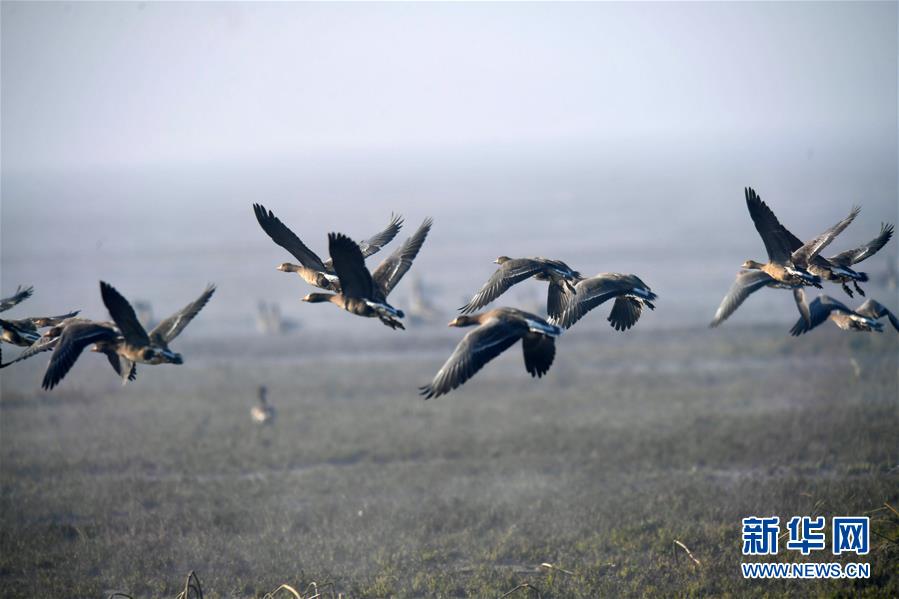 12月8日,一群候鸟在江西省南昌市新建区南矶湿地上空飞翔。 近日,大批候鸟飞抵位于鄱阳湖南部的南矶湿地越冬。 新华社记者 彭昭之 摄