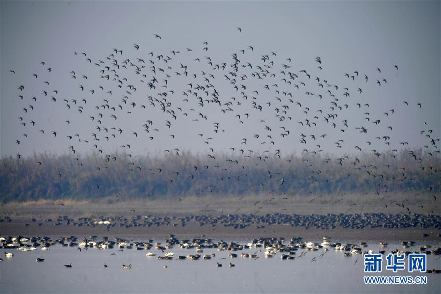 12月8日,一群候鸟从江西省南昌市新建区南矶湿地上空飞过。 近日,大批候鸟飞抵位于鄱阳湖南部的南矶湿地越冬。 新华社记者 彭昭之 摄