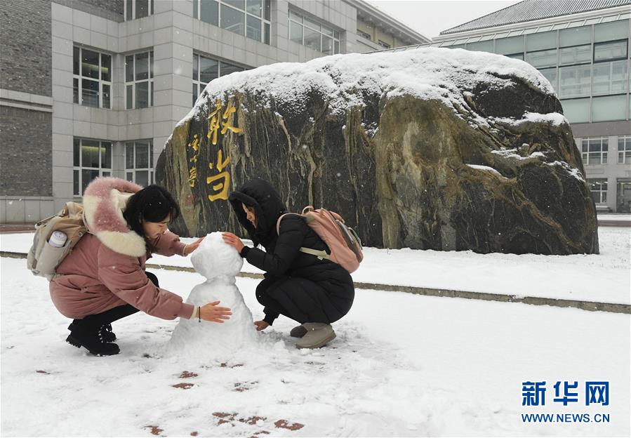 12月16日,学生在北京大学校园内堆雪人。 当日,北京迎来降雪天气。 新华社发(任超摄)