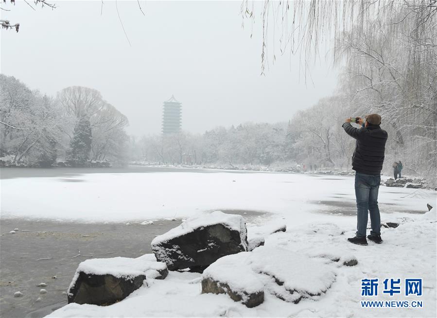 12月16日,一名男士在北京大学校园内拍摄雪景。 当日,北京迎来降雪天气。 新华社发(任超摄)