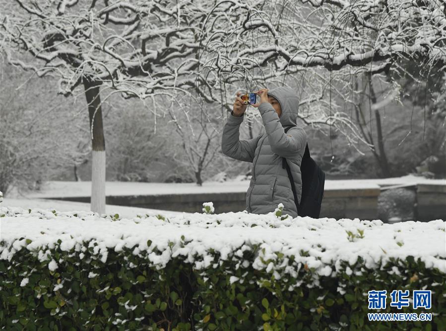 12月16日,一名学生在北京大学校园内拍摄雪景。 当日,北京迎来降雪天气。 新华社发(任超摄)