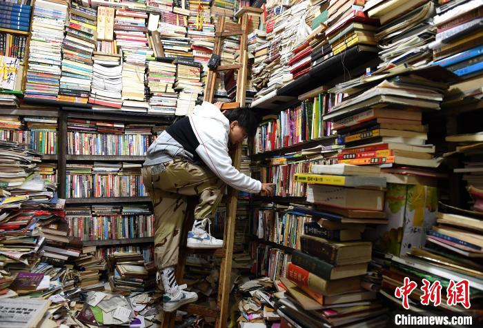 图为游客踩着梯子在旧书店内挑选书籍。 周毅 摄