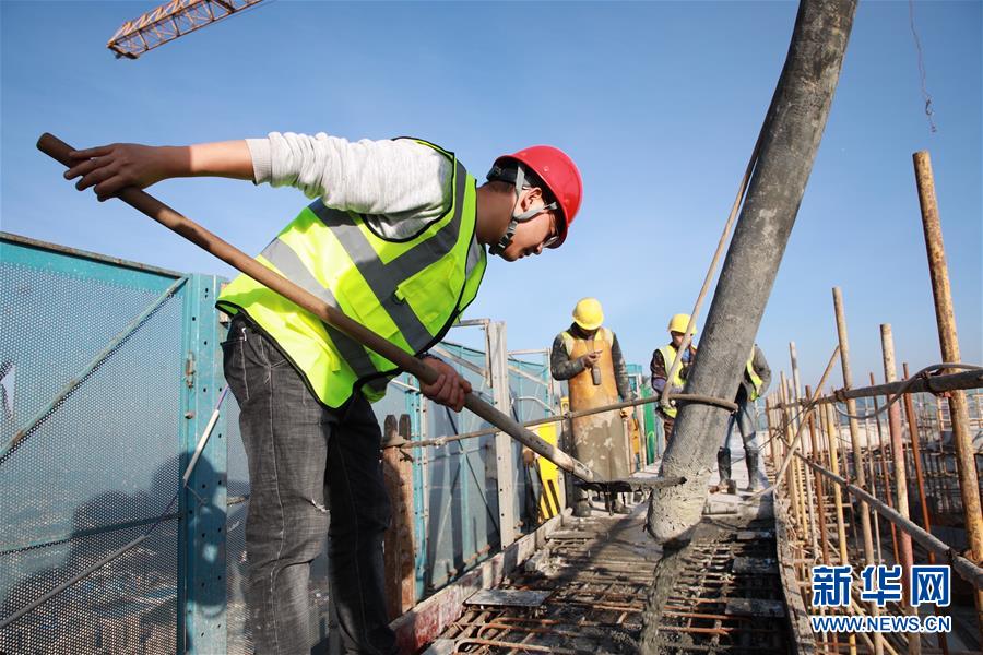 12月15日,中建西部建设贵州公司工作人员在401米高的楼顶浇灌混凝土。 新华社记者 刘续 摄