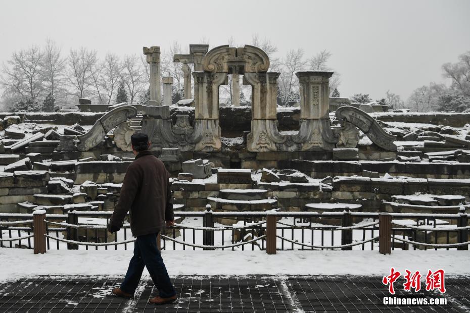 12月16日,北京迎来大雪天气,一名游客在圆明园内欣赏雪景。北京市气象台15日发布了暴雪蓝色预警和道路结冰黄色预警信号。中新社记者 崔楠 摄