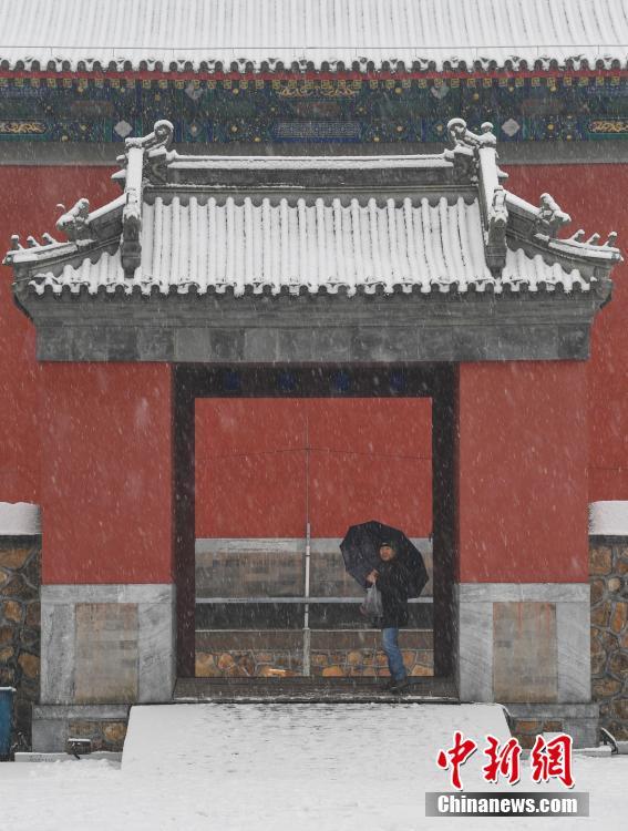12月16日,北京迎来大雪天气,一名游客在圆明园内欣赏雪景。北京市气象台15日发布了暴雪蓝色预警和道路结冰黄色预警信号。中新社记者 崔楠 摄