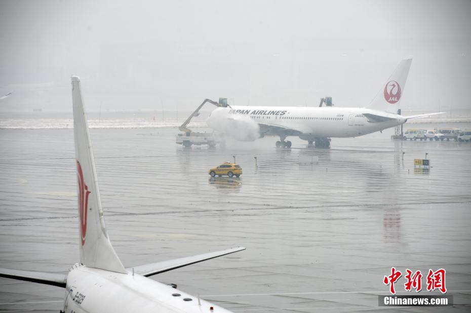 12月16日,在北京首都国际机场停靠的民航客机正在接受除冰作业。15日19时至16日9时,北京市平均降水量3.9毫米,城区平均3.3毫米。中新社记者 侯宇 摄