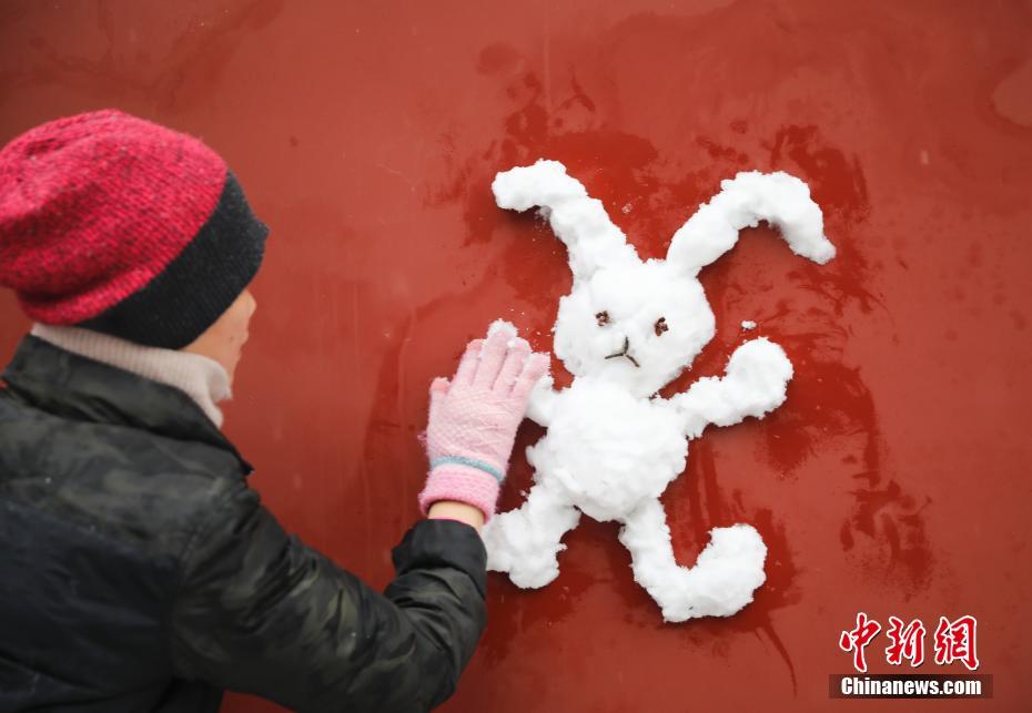 12月16日,游客在北京天坛公园红墙上做雪雕。当日,北京迎来今冬第二场雪,天坛公园银装素裹,美不胜收。 中新社记者 赵隽 摄