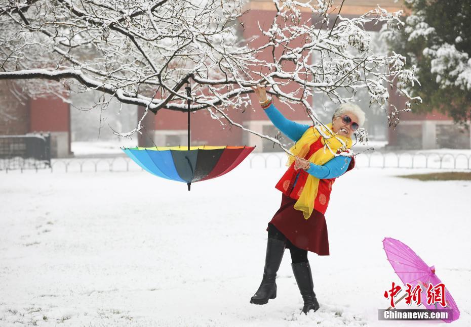 12月16日,一位老者在天坛公园内留影。当日,北京迎来今冬第二场雪,天坛公园银装素裹,美不胜收。 中新社记者 赵隽 摄