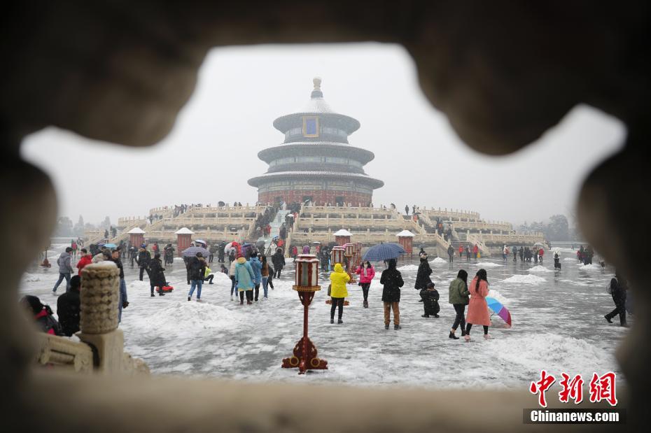 12月16日,游客在北京天坛公园欣赏雪景。当日,北京迎来今冬第二场雪,天坛公园银装素裹,美不胜收。 中新社记者 赵隽 摄