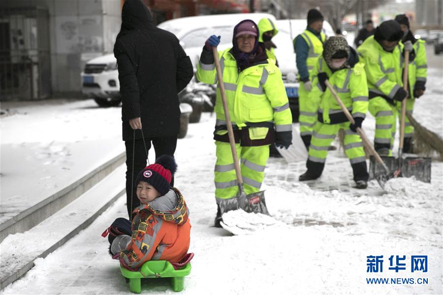 12月17日,在哈尔滨市南岗区南直路,环卫工人在街头清扫积雪,一名家长拉着坐在爬犁上的孩子从旁边经过。 当日,雪后的哈尔滨呈现出别样的景致。 新华社发(张涛 摄)